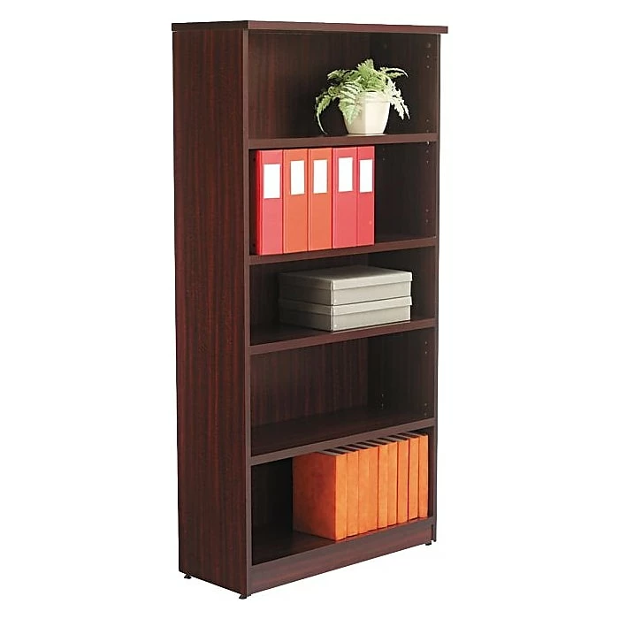 - 5-shelf bookcase cabinet features three fixed position shelves (including bottom shelf) and two adjustable position shelves