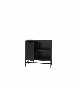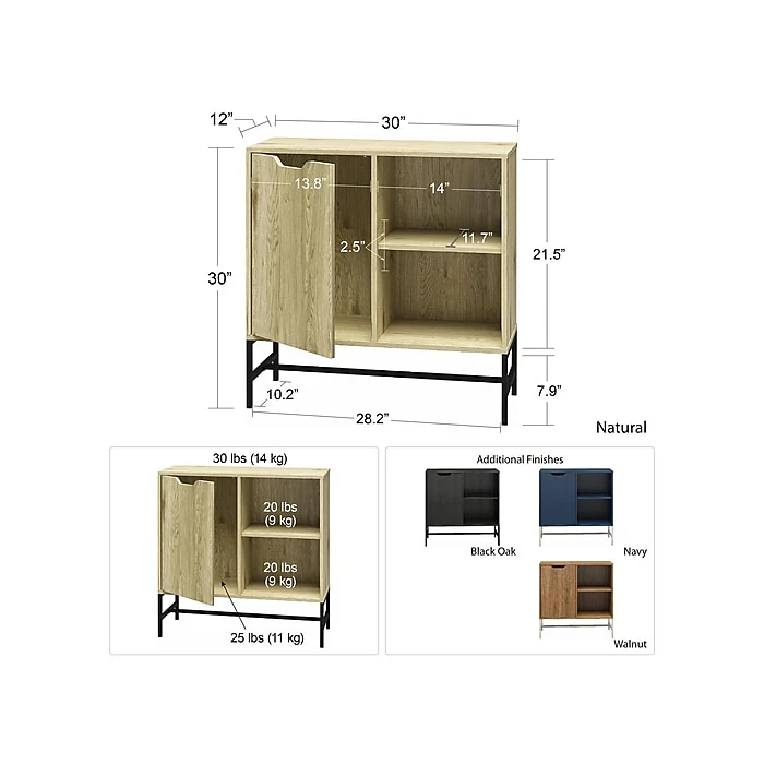 - Two open shelves (one fixed, one adjustable) and one closed cabinet shelf for books and other essentials