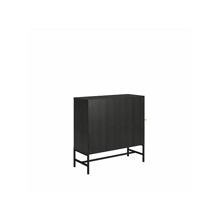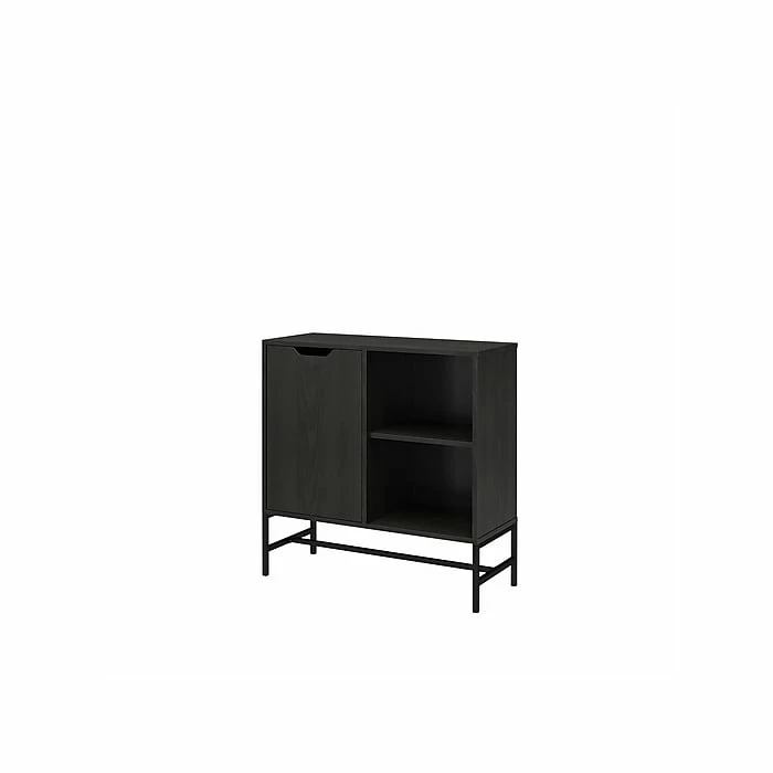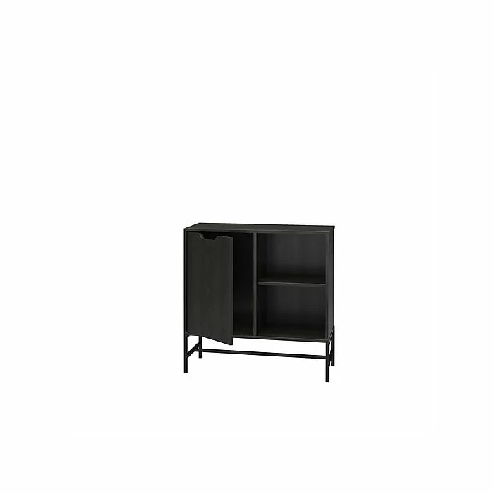 - Modern bookcase made of durable MDF in a black oak finish and sturdy powder-coated metal