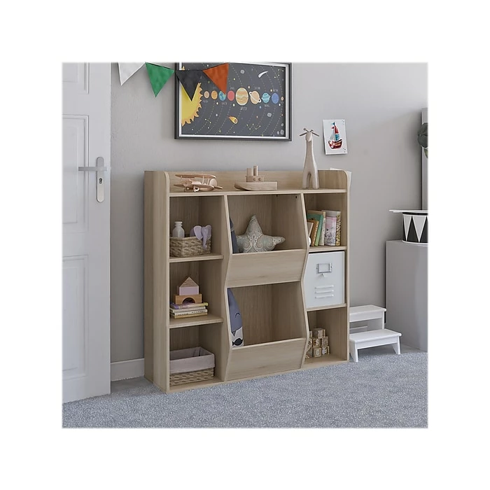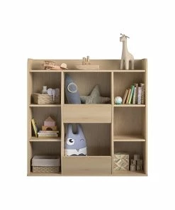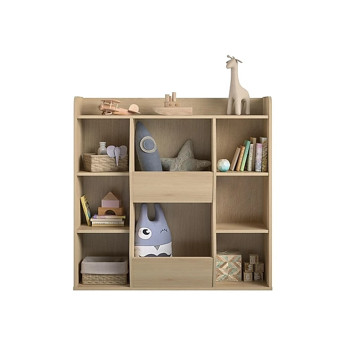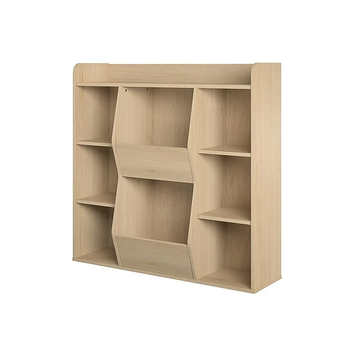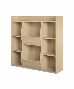 - Large kids’ toy storage bookcase made of particleboard in a blonde oak finish