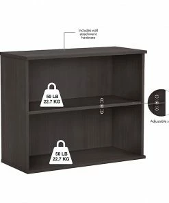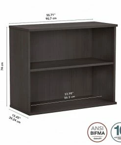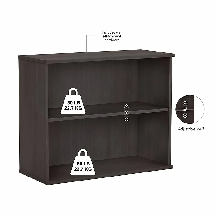 Keep work materials organized and accessible while conveying a classic, professional appearance with the Bush Business Furniture small two-shelf bookcase. Use the shelves to store books, reference materials, and supplies, or give your office a personal touch with pictures and decorations. One shelf is fixed for stability, and the other can be raised or lowered to accommodate items of various sizes. Each shelf supports up to 50 lbs., so storing larger materials is no problem. The efficient design and commercial-quality construction of this low bookcase make it an ideal storage and display solution for home and professional offices alike. A stable design and included wall attachment hardware provide peace of mind in every work environment. This small bookcase has been tested to meet ANSI/BIFMA quality standards for safety and performance and is backed by a 10-year manufacturer warranty.