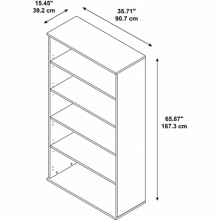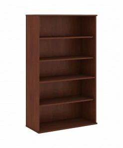 The Bush Business Furniture 66H 5 Shelf Narrow Bookcase in Hansen Cherry with a durable, thermally fused laminate surface offers superior resistance to scratches and stains. The 36W Bookcase features two fixed shelves for stability with three adjustable shelves for storage flexibility. Personalize your office with books, photos and decorative accents with Bush Business Furniture Bookcases in six finishes and five height options, plus wall attachment hardware included. Meets ANSI/BIFMA standards for safety and performance in place at time of manufacture, backed by Bush Business Furniture 10 Year Warranty and American made.