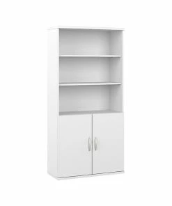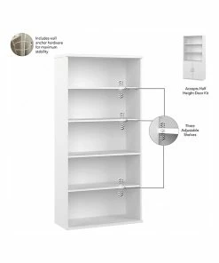 The Bush Business Furniture Hybrid tall five-shelf bookcase with doors offers a stylish, long-lasting storage and display solution for the modern professional. Organize books and other reference materials, or give your workspace a personal touch with pictures and decorations on the shelves that support up to 50 lbs. each. Two shelves are fixed for stability while three can be raised or lowered to accommodate items of various sizes. The cabinet doors conceal the two lower shelves for the materials you want kept in order but out of sight. The tall bookshelf’s stable design and included wall attachment hardware make it a safe choice for use in virtually any home or professional office environment. Find the perfect look for your space with five contemporary finish options: black walnut, modern hickory, platinum gray, storm gray, and white. This tall bookcase cabinet has been meticulously tested to meet or exceed ANSI/BIFMA quality standards for safety, durability, and performance and is backed by the Bush Business Furniture 10-year manufacturer warranty. See the full Hybrid collection for coordinating items to enhance your workspace as needed, including computer desks, file cabinets, and storage cabinets (coordinating items sold separately). American-made with US and imported parts.