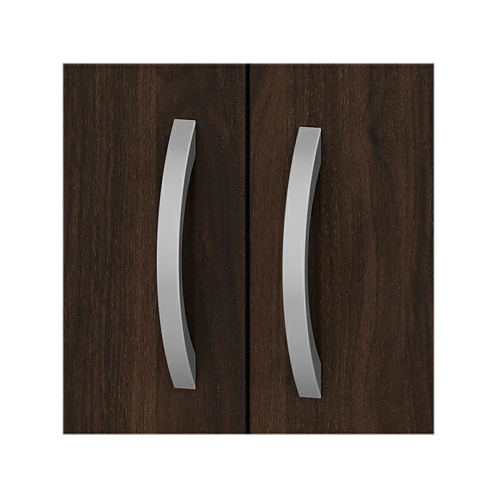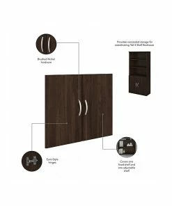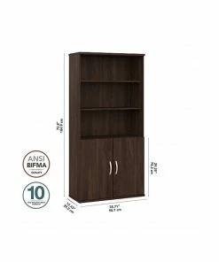 The Bush Business Furniture Hybrid tall five-shelf bookcase with doors offers a stylish, long-lasting storage and display solution for the modern professional. Organize books and other reference materials, or give your workspace a personal touch with pictures and decorations on shelves that support up to 50 lbs. each. Two shelves are fixed for stability, while three can be raised or lowered to accommodate items of various sizes. Cabinet doors conceal the two lower shelves for the materials you want to be kept in order but out of sight. The tall bookshelf’s stable design and included wall attachment hardware make it a safe choice for use in virtually any home or professional office environment. Find the perfect look for your space with five contemporary finish options: black walnut, modern hickory, platinum gray, storm gray, and white. This tall bookcase cabinet has been meticulously tested to meet or exceed ANSI/BIFMA quality standards for safety, durability, and performance and is backed by the Bush Business Furniture 10-year manufacturer warranty. See the full Bush Business Furniture Hybrid collection for coordinating items to enhance your workspace as needed, including computer desks, file cabinets, and storage cabinets (coordinating items sold separately). American-made with US and imported parts.