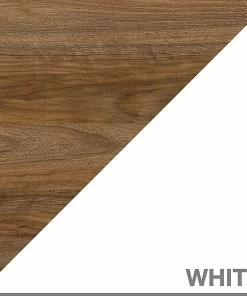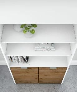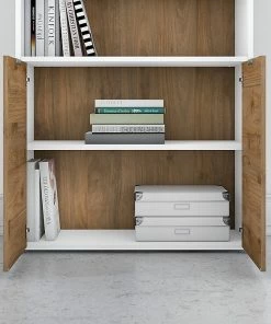 - Five-shelf bookcase with doors made of thermally fused laminate over composite wood in a fresh walnut and white finish