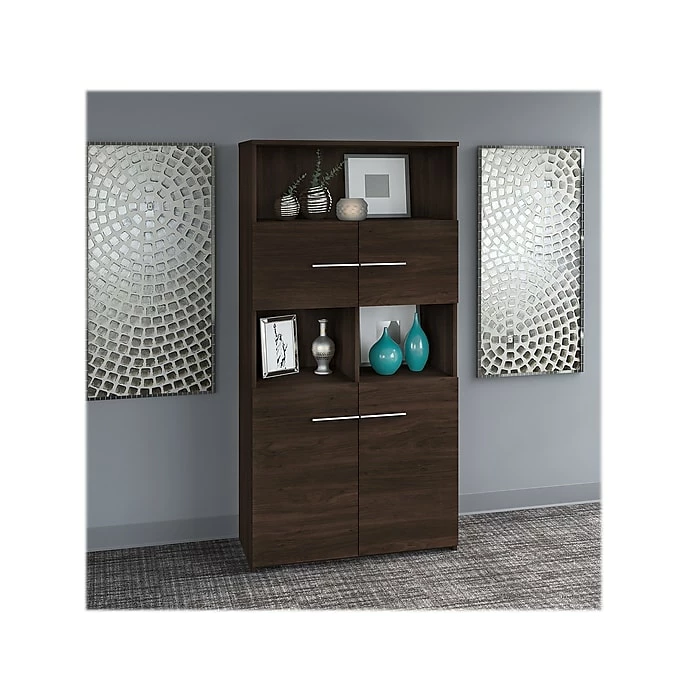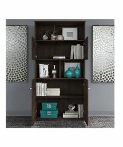 The Bush Business Furniture Office 500 five-shelf bookcase with doors is a great way to stay organized while showcasing your unique style and personality. Use the bottom storage cabinet to conceal the books, binders, and other reference materials you want to be kept in order but out of sight. The cabinet contains one fixed shelf and one adjustable shelf to accommodate items of various sizes. The upper half of the tall bookcase features two cubbies and a long top shelf that are perfect for displaying pictures, awards, and decorations. A smaller cabinet offers even more space to organize office supplies and materials. Shelves support up to 50 lbs. each. This modern bookcase with doors meets or exceeds ANSI/BIFMA quality standards for safety and performance and is backed by a 10-year manufacturer limited warranty. American-made with US and imported parts.
