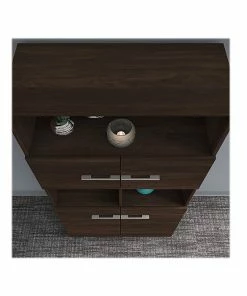 - Standard bookcase with doors is made of thermally fused laminate over composite wood in a black walnut finish