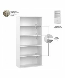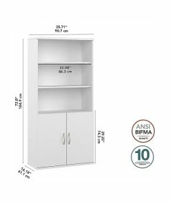 The Bush Business Furniture Studio A tall five-shelf bookcase with doors combines a fresh contemporary appearance with the commercial-quality construction needed to withstand years of everyday use. Organize books and reference materials, or display pictures and decorations on the shelves that support up to 50 lbs. each. Two shelves are fixed for stability, while three can be raised or lowered to accommodate items of various sizes. The cabinet doors conceal the two lower shelves for the materials you want kept in order but out of sight. The tall bookcase’s stable design and wall attachment hardware make it a safe choice for use in virtually any home or professional office environment. This tall bookcase has been meticulously tested to meet or exceed the ANSI/BIFMA standards for safety, durability, and performance and is backed by a 10-year warranty. American-made with US and imported parts.