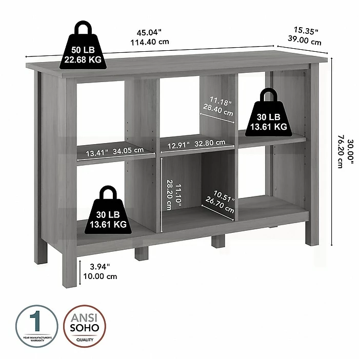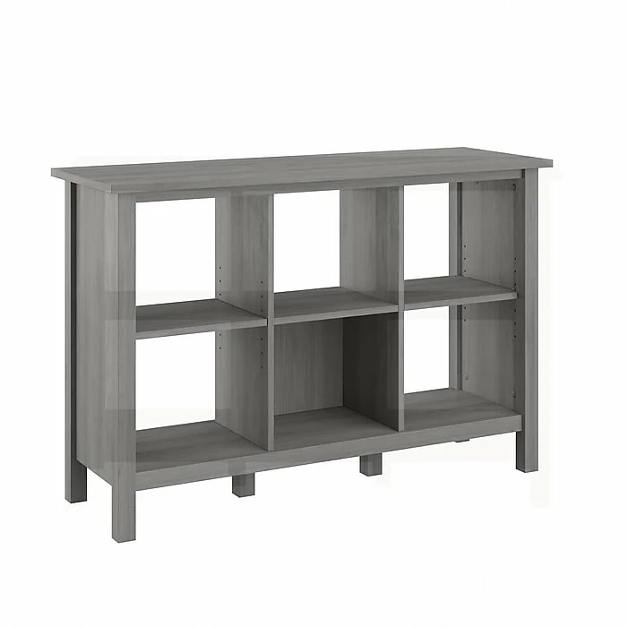 Open and airy, the Bush Furniture Broadview six-cube bookcase breathes contemporary life into your home office or living space. Brighten up any room with art and collectibles or bring a modern flair to work while organizing books, binders, and reference materials. Six storage cubbies with two adjustable shelves let you customize the cube bookcase to showcase decorations and materials of varying shapes and sizes. Each shelf supports up to 30 lbs., so you can store larger items with confidence. Closed side panels and an open back coordinate with existing decor as you display your prized possessions. A sturdy post leg design provides years of trouble-free use in virtually any residential space. This cube bookcase is tested to meet ANSI/SOHO standards for safety and performance and is backed by a 1-year manufacturer limited warranty. See the full collection for coordinating items available.
