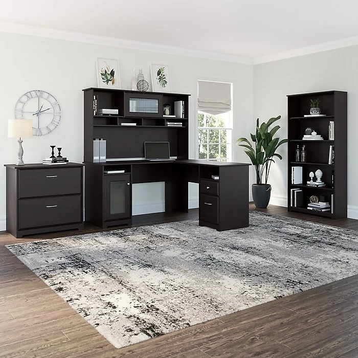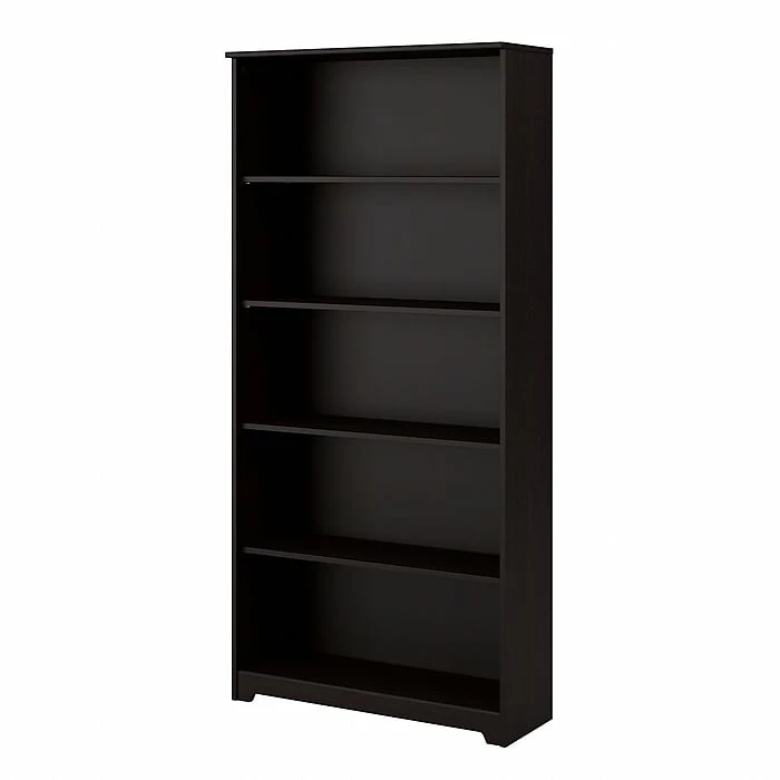This attractive Bush Furniture Cabot 5 Shelf Bookcase is perfect for the home office or anywhere storage is needed. Its slender profile and 5 shelf design mix style with function at a great value. Use on its own or group a few together for a complete storage wall design. When outfitting an office use this Bookcase next to the Cabot Desk with Hutch combination (sold separately) for a seamless look as they match in height. The sophisticated, stable design has two fixed shelves for structural strength while three adjustable shelves let you customize so all of your items are sure to fit. The bookshelf lets you easily stow books, binders, decorative bins, accents and more. Meets ANSI/SOHO test standards for safety and performance. A stylish and timeless design with rich finish complements any environment. See the full collection for coordinating items. Backed by a 1 Year Warranty.