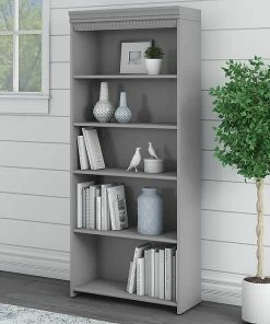 Bring a slice of modern farmhouse styling into any home office or living space with the Bush Furniture Fairview tall five-shelf bookcase. Three adjustable shelves move up and down to accommodate books and decorations of various sizes while two fixed shelves provide extra stability. Each shelf supports up to 50 lbs., so organizing a collection of paperback and hardcover books is no problem. This bookcase offers plenty of vertical storage to keep your personal library in order without taking up too much floor space. Use a single bookcase on its own, or place a set of two or more side by side for even more storage and display capacity. This farmhouse bookcase is tested to meet ANSI/SOHO quality standards for safety and performance and is backed by a 6-year manufacturer warranty. See the full collection for coordinating items to complete your space with relaxed cottage styling.