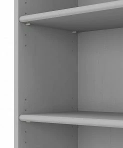 - Tall bookcase made of laminate over engineered wood in Cape Cod gray finish