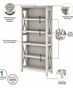 The Bush Furniture Key West tall five-shelf bookcase is a perfect way to show off your favorite artwork, photos, plants, and more. Three adjustable shelves accommodate items of various sizes while two fixed shelves provide stability. Each shelf supports up to 50 lbs. so you can store your personal library and display decorations with confidence. Stylish touches include unique X-pattern accents on the side panels as well as a sturdy and attractive post leg design. This five-tier bookcase includes wall attachment hardware for family-friendly safety and security in any home office or living room. A perfect choice for homes that embrace cottage, coastal, and farmhouse decor, the Bush Furniture Key West collection includes a variety of coordinating items to expand your space as needed. This tall bookcase is tested to meet ANSI/SOHO quality standards for safety and performance and is backed by a 1-year manufacturer warranty.
