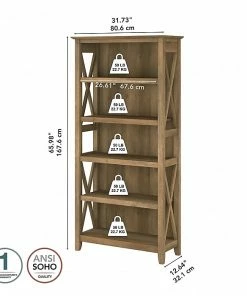 The Bush Furniture Key West tall five-shelf bookcase is a perfect way to show off your favorite artwork, photos, plants, and more. Three adjustable shelves accommodate items of various sizes while two fixed shelves provide stability. Each shelf supports up to 50 lbs. so you can store your personal library and display decorations with confidence. Stylish touches include unique X-pattern accents on the side panels as well as a sturdy and attractive post leg design. This five-tier bookcase includes wall attachment hardware for family-friendly safety and security in any home office or living room. A perfect choice for homes that embrace cottage, coastal, and farmhouse decor, the Bush Furniture Key West collection includes a variety of coordinating items to expand your space as needed. This tall bookcase is tested to meet ANSI/SOHO quality standards for safety and performance and is backed by a 1-year manufacturer warranty.
