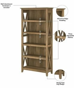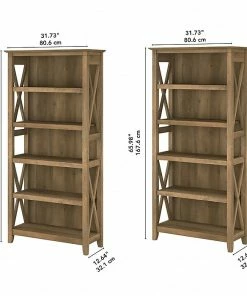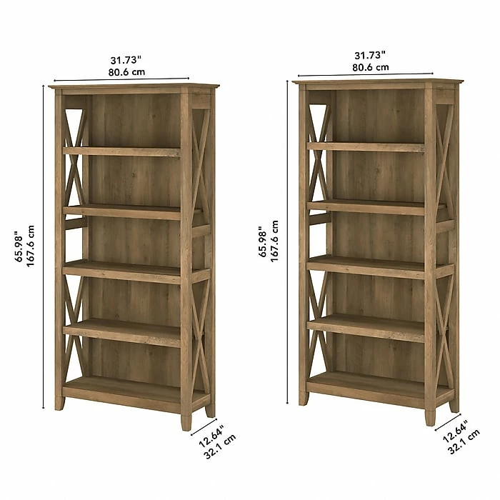 The Bush Furniture Key West tall five-shelf bookcase set is a perfect way to show off your favorite artwork, photos, plants, and more. These matching bookcases each include three adjustable shelves to accommodate items of various sizes and two fixed shelves for stability. Each shelf supports up to 50 lbs. so you can store your collection of paperback and hardcover books or display decorations with confidence. Place the tall bookshelf set side by side to create a storage wall or position them separately based on the needs of your space. Stylish touches include X-pattern accents on the side panels as well as a sturdy and attractive post-leg design. Wall attachment hardware is included for family-friendly safety and security in any home office or living room. These five-shelf bookcases are tested to meet ANSI/SOHO quality standards for safety and performance and are backed by a 1-year manufacturer warranty.