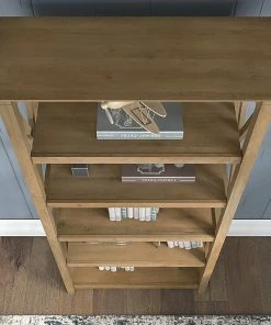 - Five-shelf bookcase set made of laminate over engineered wood in reclaimed pine finish