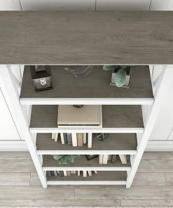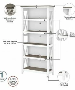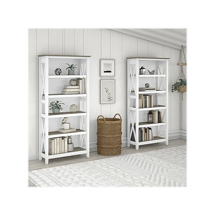 The Bush Furniture Key West tall five-shelf bookcase set is a perfect way to show off your favorite artwork, photos, plants, and more. These matching bookcases each include three adjustable shelves to accommodate items of various sizes and two fixed shelves for stability. Each shelf supports up to 50 lbs. so you can store your collection of paperback and hardcover books or display decorations with confidence. Place the tall bookcases side by side to create a storage wall or position them separately based on the needs of your space. Stylish touches include X-pattern accents on the side panels as well as a sturdy and attractive post leg design. Wall attachment hardware is included for family-friendly safety and security in any home office or living room. These five-shelf bookcases are tested to meet ANSI/SOHO quality standards for safety and performance and are backed by a 1-year manufacturer warranty.