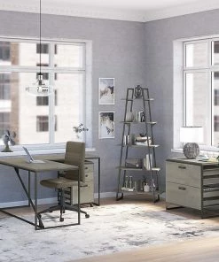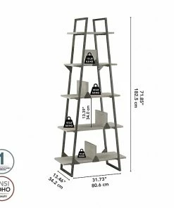 The Bush Furniture Refinery A-frame etagere bookcase brings strength, style, and functionality into any home office, loft, or living room. Organize your personal library, or show off your favorite pictures and decorations with five fixed shelves, four free-moving dividers, and one beautifully aged design. Unique and sturdy, the tall bookcase design features open industrial steel sides along with exposed bolts and a distressed finish to complement your rustic industrial home decor. Move the dividers anywhere on the five-shelf bookcase to decorate or organize your home office. Wall attachment hardware is included to provide family-friendly safety and security anywhere in the home. This etagere bookcase has been tested to meet ANSI/SOHO standards for safety and performance and is backed by a 1-year warranty. View the full line of industrial furniture to find the perfect fit for your space.