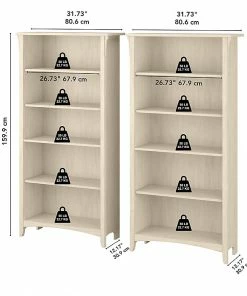Decorative yet functional, this Bush Furniture Salinas set of two five-shelf bookcases brings comfortable storage and display to any room in your home. Inspired by timeless mission style, the set conveys a relaxing farmhouse charm with its attractive wood accents and tapered legs. Decorative detailing and curved base rails create a casual construction equally fit for a living room or home office. Each tall bookcase is built with three adjustable shelves for flexible storage and two fixed shelves for stability to proudly display your personal library along with photos and decorations. Each shelf supports up to 50 lbs., so storing larger items is never a problem. This matching bookcase set is tested to meet ANSI/SOHO standards for safety and performance and is backed by a 1-year manufacturer warranty. See the full collection for coordinating items available.