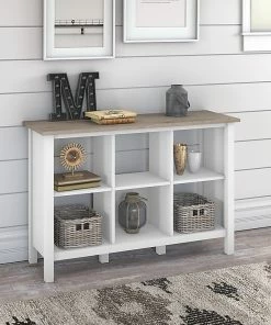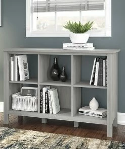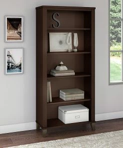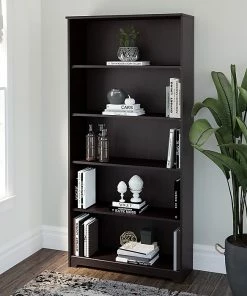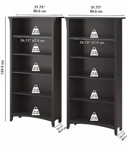 Decorative yet functional, this Bush Furniture Salinas set of two five-shelf bookcases brings comfortable storage and display to any room in your home. Inspired by timeless mission style, the set conveys a relaxing farmhouse charm with its attractive wood accents and tapered legs. Decorative detailing and curved base rails create a casual construction equally fit for a living room or home office. Each tall bookcase is built with three adjustable shelves for flexible storage and two fixed shelves for stability to proudly display your personal library along with photos and decorations. Each shelf supports up to 50 lbs., so storing larger items is never a problem. This matching bookcase set is tested to meet ANSI/SOHO standards for safety and performance and is backed by a 1-year manufacturer warranty. See the full collection for coordinating items available.