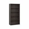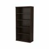 - Set of two five-shelf bookcases is made of laminate over engineered wood in vintage black finish