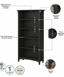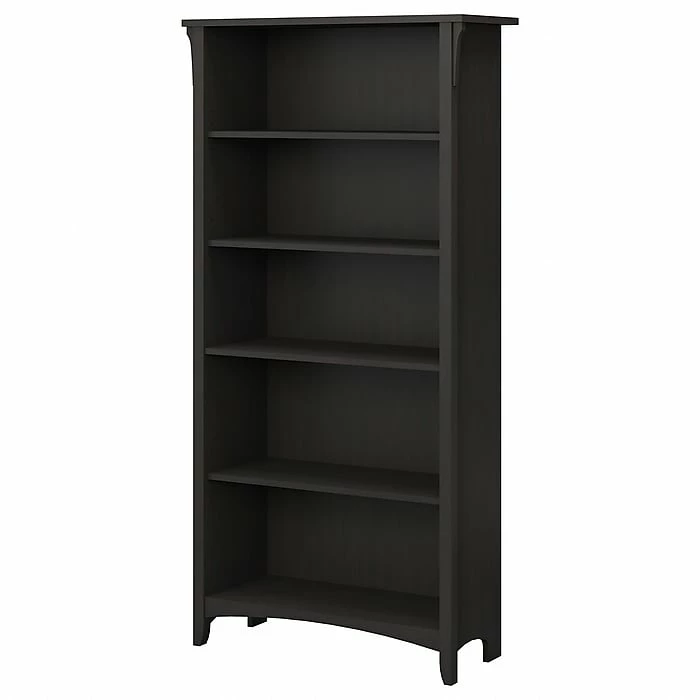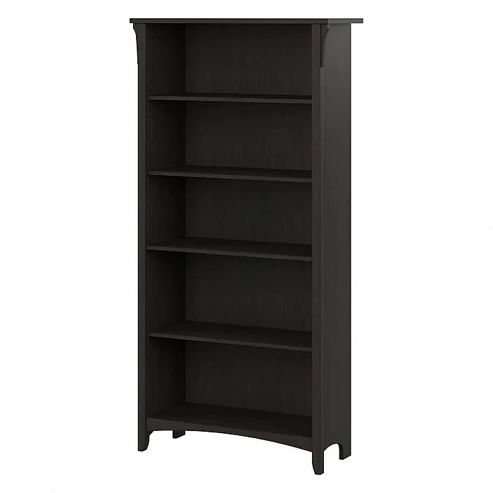 Decorative yet functional, the Bush Furniture Salinas 5 Shelf Bookcase feels comfortable anywhere from a cottage to a family home or apartment. The black Bookcase brings a country flair with a hint of timeless Mission styling into the homes of today as attractive wood accents join appealing tapered legs. Decorative detailing and curved base rails create a casual construction equally fit for a living room, home office, dorm or bedroom. Built with 3 adjustable and 2 fixed shelves, the Bookcase proudly displays your favorite photos and decorations while helping you stay organized. Finished in an on-trend Vintage Black with a slightly distressed touch, the casual charm of Salinas will have you feeling relaxed wherever you call home. Backed by a Bush Furniture 1 Year Manufacturer’s Warranty, the 5 Shelf Bookcase meets ANSI/SOHO standards for safety and quality.