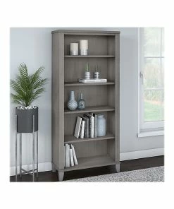 Turn any space into your own personal library with the Bush Furniture Somerset 5 Shelf Bookcase. With a tapered leg design and your choice of three beautiful finishes, this bookshelf is a perfect choice to complete your home office. Two shelves are fixed to provide structural strength, and three are adjustable so your items are sure to fit. The height of the Bookcase matches that of a Somerset Desk with Hutch combination to create a coordinated appearance. Its sturdy construction and durable laminate finish allow you to display books, trinkets and more for years to come. This quality furniture is tested to meet ANSI/SOHO standards for safety and performance and is backed by the Bush Furniture 6 Year Manufacturer’s Warranty. See the full Somerset Collection for coordinating items to expand your home office. American made with U.S. and imported parts.