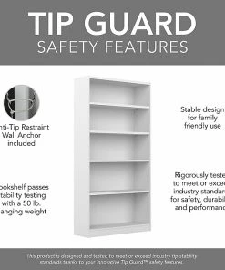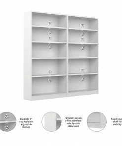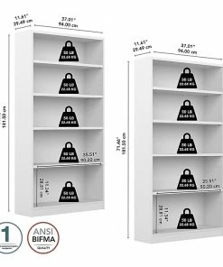 The Bush Furniture Universal Tall 5 Shelf Bookcase – Set of 2 provides a versatile organization solution that allows you to show off your personal library or brighten up the room with pictures and decorations. Each Bookcase has three adjustable shelves that move up and down to accommodate larger items like binders and photo albums while two fixed shelves offer added stability. The sturdy one-inch thick shelves prevent sagging and have a weight capacity of 50 pounds each, so storing magazines, hardcover books, or vinyl records is never a problem. Tip Guard(TM) safety features include a stable design and wall attachment hardware for family-friendly safety in any space. The bookcases have been tested with a 50 pound hanging weight to create a safe environment in any space. This tall bookshelf set meets ANSI/BIFMA standards for safety and performance and is backed by a 1 Year Warranty.