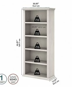 The Bush Furniture Yorktown tall five-shelf bookcase presents a stylish and practical solution for organizing any work or living space. Use the five-tier bookshelf to showcase your personal library or brighten up the room with pictures and home decor. Three adjustable shelves move up and down to accommodate items of various sizes while two shelves are fixed for stability. Each shelf supports up to 25 lbs., so you can store a collection of hardcover books and display larger decorations with confidence. Wall attachment hardware is included for family-friendly safety and security. Bush Furniture Yorktown’s classic charm is highlighted by stylish beveled edge detailing and comes in your choice of several attractive finishes. This vertical bookshelf is tested to meet ANSI/SOHO standards for safety and performance and is backed by a 1-year manufacturer warranty. See the full collection for coordinating items available.
