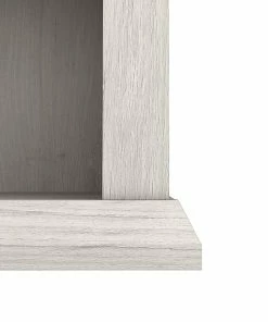 - Tall bookcase made of laminate over engineered wood in linen white oak finish