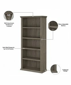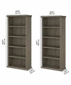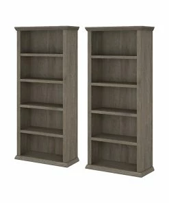 The Bush Furniture Yorktown tall five-shelf bookcase set of two presents a stylish and practical solution for organizing any work or living space. Use the matching bookcase set to showcase your personal library or brighten up the room with pictures and home decor. Each bookcase includes three adjustable shelves that move up and down to accommodate items of various sizes and two shelves that are fixed for stability. Each shelf supports up to 25 lbs., so you can store a collection of hardcover books and display larger decorations with confidence. Wall attachment hardware is included for family-friendly safety and security. Bush Furniture Yorktown’s classic charm is highlighted by stylish beveled edge detailing and comes in your choice of several attractive finishes. This tall bookshelf set is tested to meet ANSI/SOHO standards for safety and performance and is backed by a 1-year manufacturer warranty.