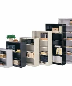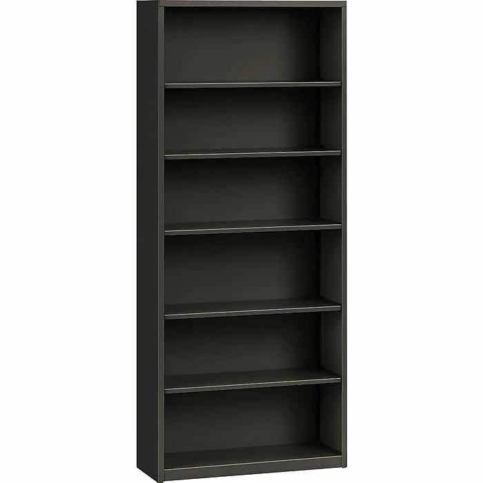HONยฎ Brigadeโข Metal bookcase in charcoal color measuring 80 1/8″ x 34 1/2″ x 12 5/8″ has 11 3/4″ deep shelves that adjust in 1/2″ increments to hold any size item safely. Bookcase with six shelves has a heavy-duty construction for durability.
