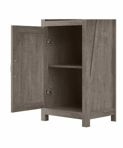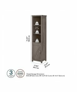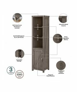The kathy ireland Home by Bush Furniture Cottage Grove tall narrow five-shelf bookcase with door offers a practical storage and display solution with appealing modern farmhouse style. Use the top of the bookshelf to brighten up any room with pictures and decorations or organize a collection of paperback and hardcover books. Two of the upper shelves can be raised or lowered to accommodate items of various sizes, and the bottom storage cabinet also contains an adjustable shelf so larger materials can be kept in order but out of sight. Each shelf supports up to 50 lbs. Hardware is included to anchor the bookcase to a wall for maximum stability in your home office, living room, entryway, or any other residential space.