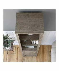 - Tall, narrow bookcase with door made of laminate over engineered wood in restored gray finish