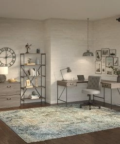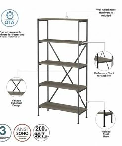 The kathy ireland Home by Bush Furniture Ironworks five-shelf etagere bookcase presents a stylish and durable organization solution for the home or office. All shelves are fixed for stability and feature a weight capacity of 25 lbs. each, while the welded steel base and framework provide structural strength and add to the Ironworks industrial era style. Open shelving allows for convenient storage of books, binders, and manuals and offers a unique display space for your favorite trinkets and mementos. Its 32″W x 66″H vertical design maximizes storage and display capacity without taking up too much floor space, making this bookshelf a good fit for any room. This tall bookcase is tested to meet the ANSI/SOHO quality standards for safety and performance and is backed by the Bush Furniture 3-year manufacturer limited warranty. See the full collection for more vintage industrial home furnishings.