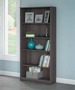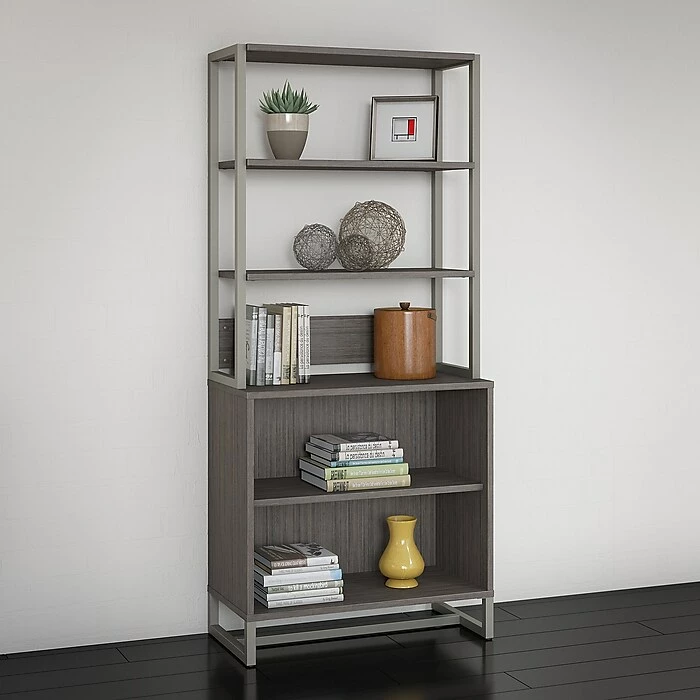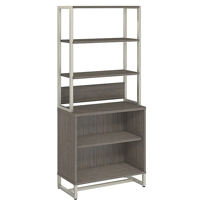 Embrace the unique styling of mid century modern design and enjoy ample storage with the Office by kathy irelandยฎ Method Bookcase Cabinet with Hutch. The 2 shelf bookcase offers a beautiful and durable titanium finished metal base. Constructed of 100% thermally fused laminate, the modern bookcase fends off scratches and stains to maintain the attractive design. Organize your favorite books and reference materials while using the adjustable shelf to fit items of varying sizes. With durable shelves and a metal frame, the Hutch mounts to the Bookcase Cabinet and offers open storage or display space for books, knickknacks, photos and more. From Office by kathy irelandยฎ and Bush Business Furniture, the Method collection comes with a 6 Year Manufacturer’s Warranty and meets ANSI/BIFMA quality test standards. American made with U.S. and imported parts.