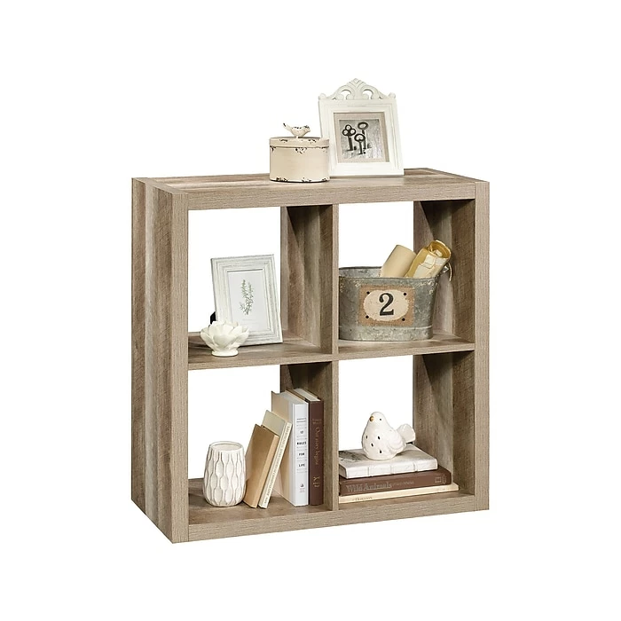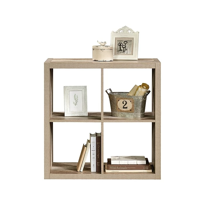 - Four-cube laminate bookcase in a lintel oak finish adds extra storage to your space