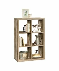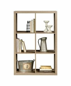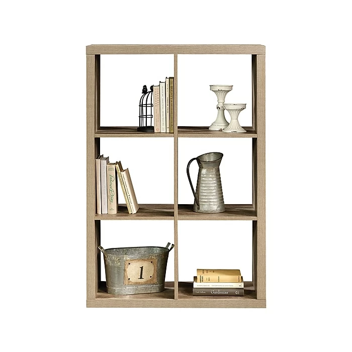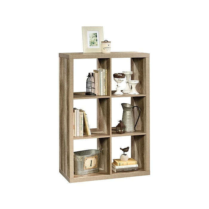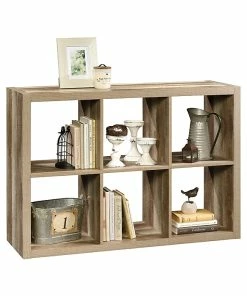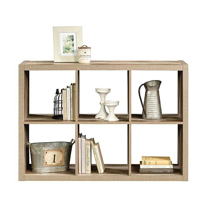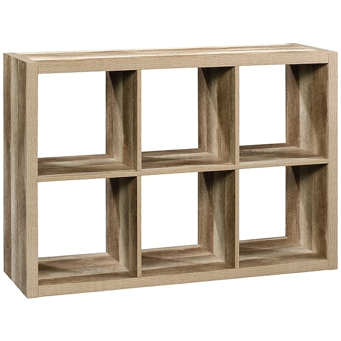 - Six-cube laminate bookcase in a lintel oak finish adds extra storage to your space
