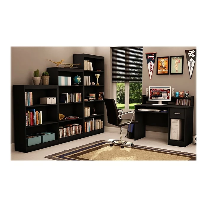 Create an attractive display area with this black bookcase. The laminate particleboard construction offers a sturdy mount for hardcover collections, figurines or photo frames, and the four open shelves provide easily accessible storage space. This South Shore Work ID bookcase has a sleek, contemporary style that fits any home or office space.