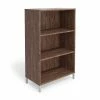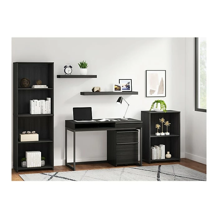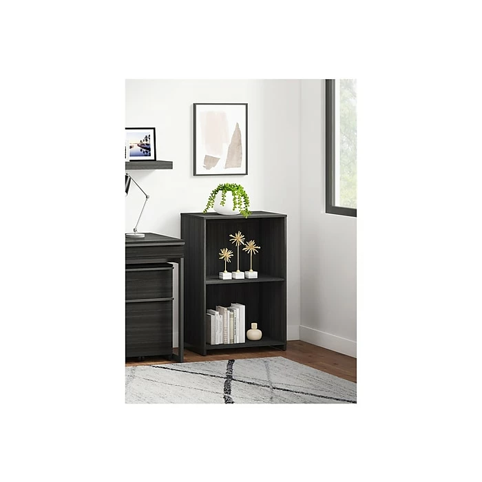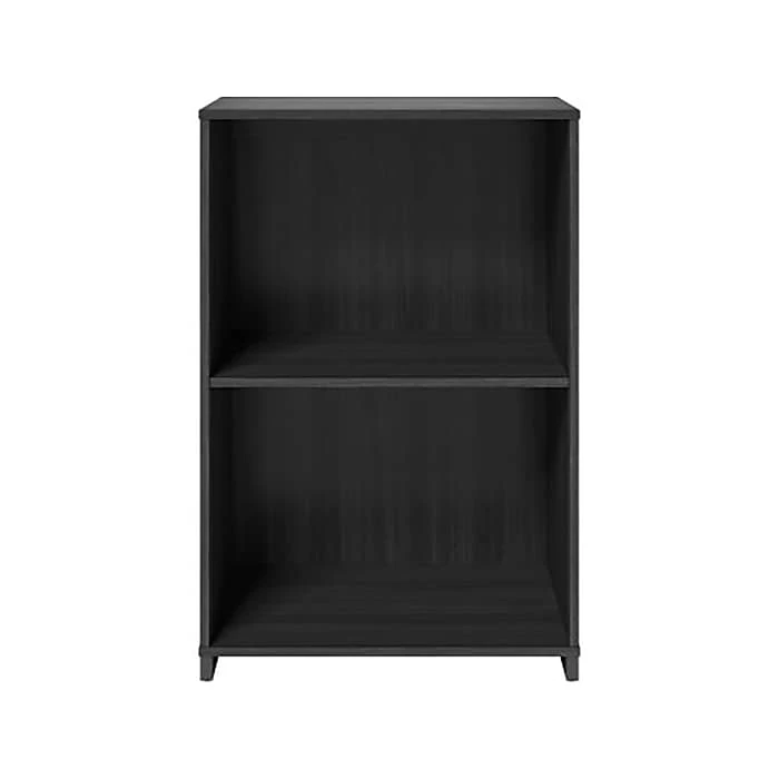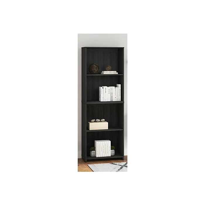- Modern-style bookcase provides plenty of storage space, featuring a durable laminate construction in a burnt ash finish