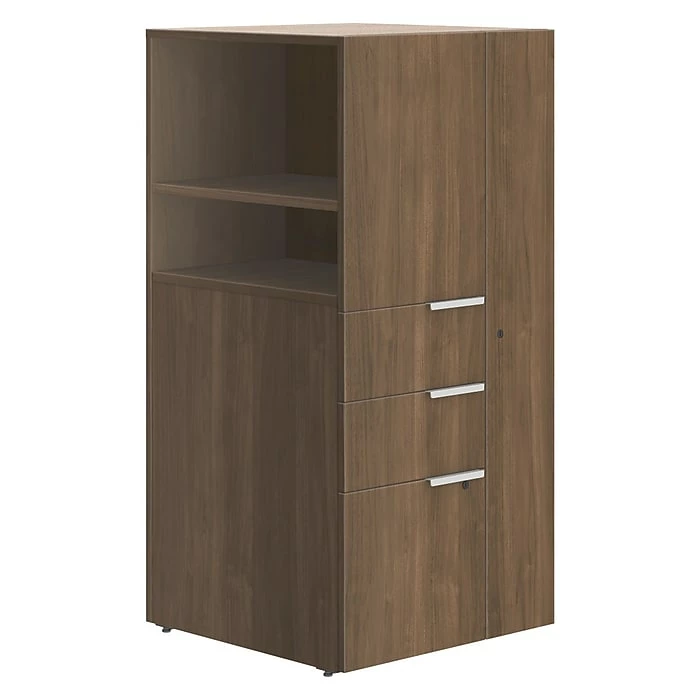 - Combines lateral filing space, supply storage, a wardrobe, and convenient open shelves in a compact footprint