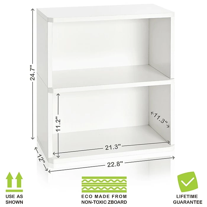 The 2-Shelf Bookcase is a standard, functional and stylish bookcase that is a welcome addition to any room. An ideal way to organize your books and any other items you want easy access to while adding a nice decorative piece to any room. Fits all types of decor! The unit is made from zBoard recycled paperboard, it is non-toxic, free from formaldehyde and VOC, making it safe for you and your family. Tool free assembly too! Just peel the 3M adhesive, stick and you’re done.