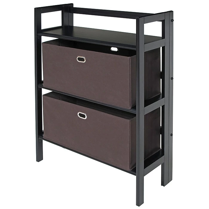This 2-Tier Foldable Shelf is made of Solid Wood and finished in Black. The color-complementing foldable baskets are constructed of sturdy fiberboard with Chocolate fabric. Carrying them is easy and secure with metal ring handles. Two units can be stacked to provide additional vertical storage space.